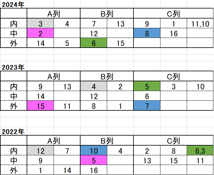 これまでと違うのは、この展開予想表の過去3年を分析し特徴を見つけます。