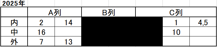 例えば、5番の馬は「A列外前」という呼び方になります。
