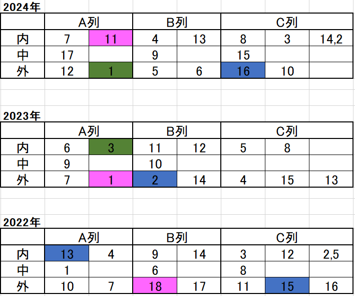 これまでと違うのは、この展開予想表の過去3年を分析し特徴を見つけます。
