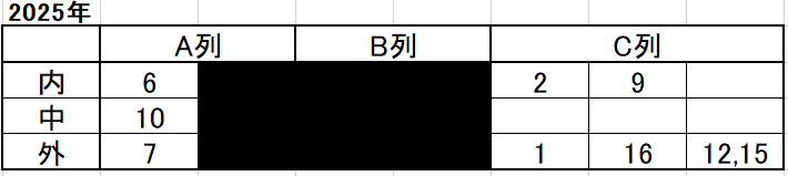 あとは有力位置取りに隣接している、A列前内側とB列外後とC列の外前側が次点となります。