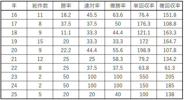 ちなみに年度別の成績です。22年を除き安定した成績です。